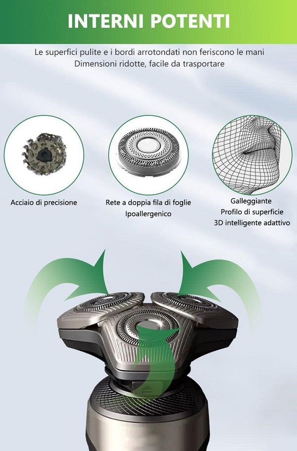 تیغه‌های Dual SteelPrecision موها را با دقت بالا کوتاه می‌کنند و سیستم اصلاح سه‌بعدی با سری‌های چرخشی، با انحنای صورت هماهنگ می‌شود. طراحی ضدآب، شستشو زیر آب و استفاده با فوم یا ژل را ممکن می‌سازد. این فناوری‌ها اصلاحی ایمن و راحت را برای پوست‌های حساس تضمین می‌کنند.