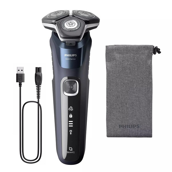 بسته‌بندی شامل استند شارژ، کیف نرم، برس تمیزکننده و کابل USB-A است. ریش تراش فیلیپس مدل S5885 اصلاح را حرفه‌ای می‌کند.