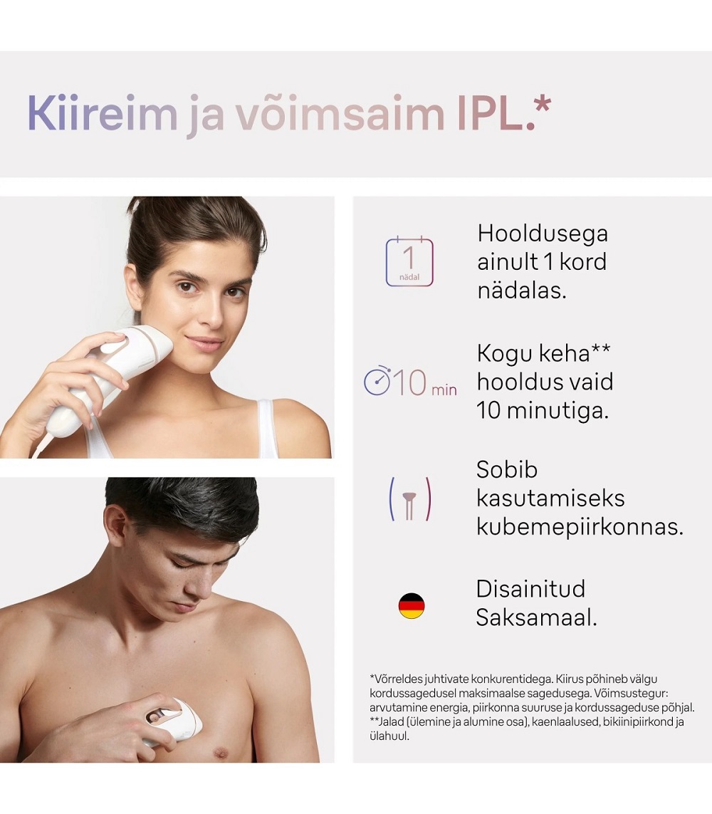 سریع ترین راه برای رفع موهای زائد بدن و رسیدن به پوستی صاف استفاده مداوم از دستگاه لیزر خانگی براون است. نتایج درمان تنها در 3 هفته اول استفاده قابل مشاهده می باشد. این دستگاه اولین سیستم IPL هوشمند جهان با هوش پاسخگو که قابلیت اجرای برنامه شخصی با پوست و موی کاربر را دارد. همچنین قابلیت ساطع کردن 400.000 پالس معادل 22 سال استفاده را دارد.