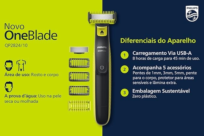 ماشین اصلاح صورت فیلیپس مدل QP2824/10 از تیغه دوطرفه استیل ضدزنگ با فناوری OneBlade بهره می‌برد. این تیغه با 200 حرکت در ثانیه، موهای بلند و کوتاه را کوتاه می‌کند. دستگاه شامل شانه‌های 1، 2، 3 و 5 میلی‌متری برای تنظیم طول اصلاح است. پوشش کربنی تیغه، حرکت روان را تضمین می‌کند. این محصول برای اصلاح خشک و مرطوب مناسب است.