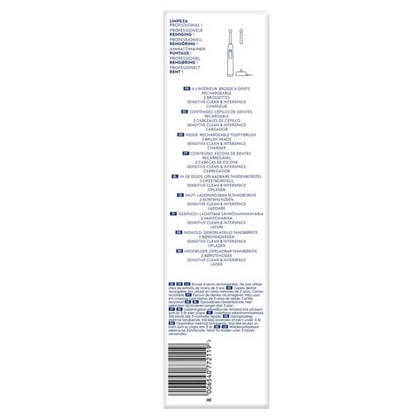محتویات جعبه شامل دسته مسواک برقی، ۲ برس سری حساس، سری بین دندانی و پایه شارژ است.